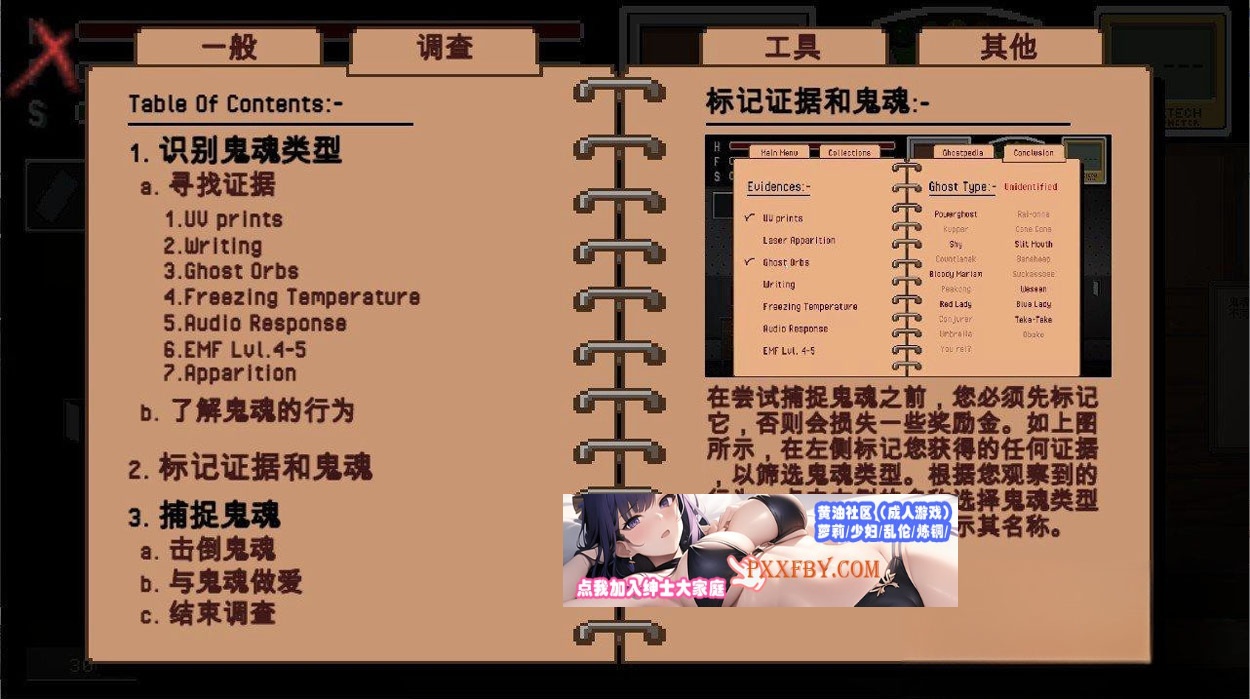 你必须在调查现场捕获幽灵。使用可以自由使用的工具,从幽灵提出的7个证据中找出3个。